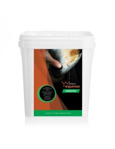 El complemento EQUINOX HOOVES enriquecido con biotina, zinc, cobre, magnesio y manganeso soporta los caballos con problemas de pezuñas.