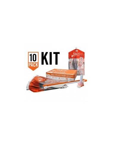 Kit completo de administración de calostro Perfect Udder ® que contiene 10 bolsas de 2 litros de calostro, 1 ensamble de tetina y 1 sonda esofágica.